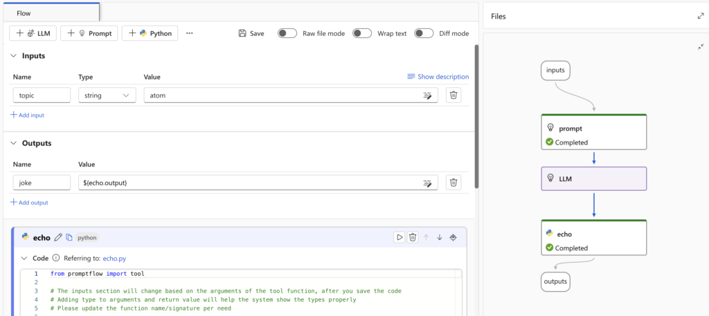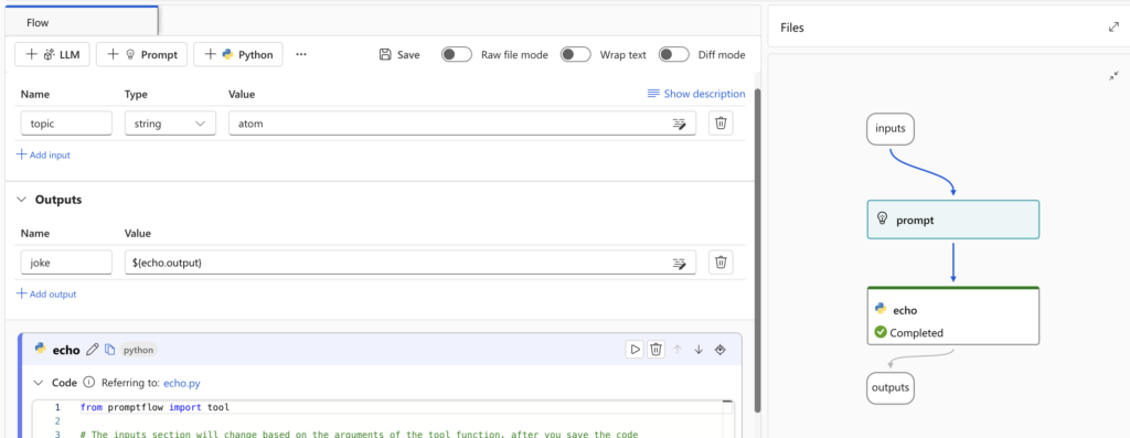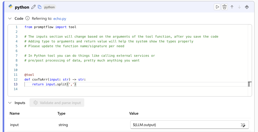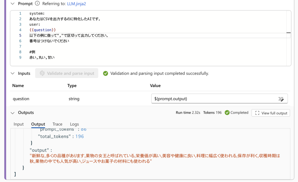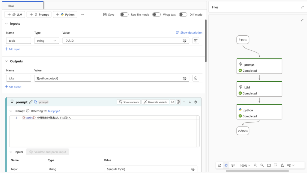 フローは以下のように、prompt → LLM → python の順に処理します。