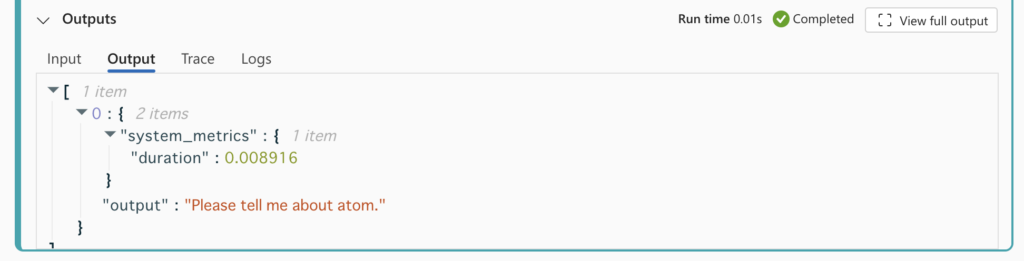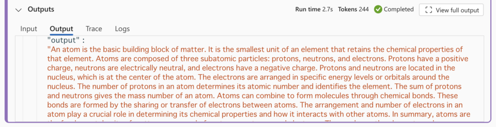 今回は、 以下のようなプロンプトを投げます。「question」に「Please tell me about atom.」が入ります。