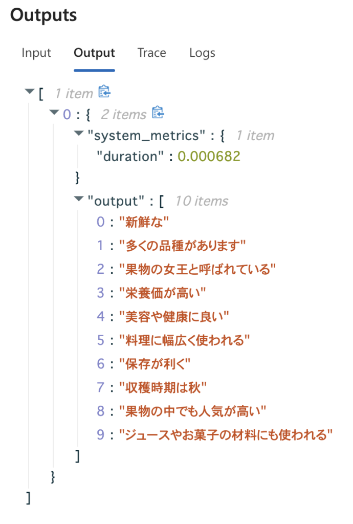 promptでは、入力値に「の特徴を10個出力してください」と付け加えます。